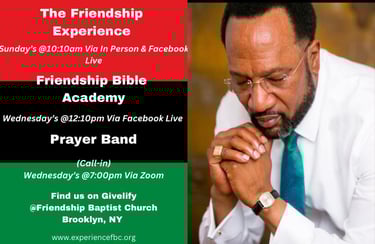 The Friendship Baptist Church has transformed from being a religious ceremony into a personal experience; which we've coined "The Friendship Experience". This experience transcends denominational & cultural lines and has found its theological voice as a liberational renewal for all. The balance of traditional & transformative ministries has released us from being compartmentalized as a one-dimensional, predictable, antiquated assembly of church people. By this, our worship experience is styled to engage the believer in worship & word. Through this unique correlation, it is more than a church service, but a moving, uplifting, challenging, and cleansing experience for anyone willing to encounter our unique presentation.